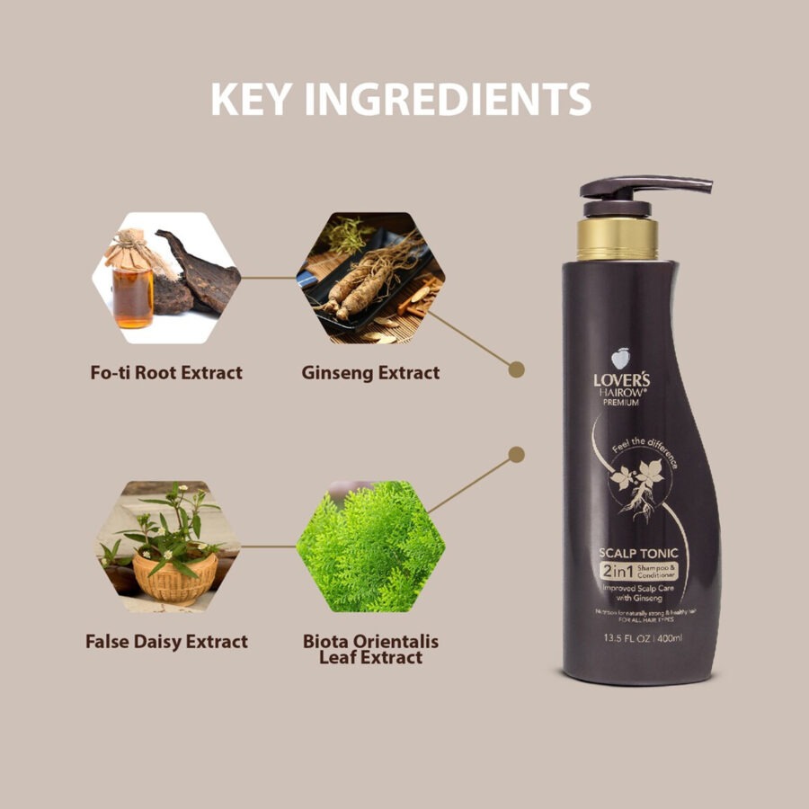 Advanced Formula : Lover’s Hairow Premium Scalp Tonic 2-in-1 Shampoo & Conditioner is a scalp care product made from natural herbal extracts to be gentle on hair and scalp and will help alleviate dandruff and itch, creating an environment to promote healthy hair growth. Lover’s Hairow Premium Scalp Tonic is developed from a secret Oriental herbal formula that contains surfactants, herbal extracts and crinum, which provide nutrition to damaged roots for healthier scalp and hair.