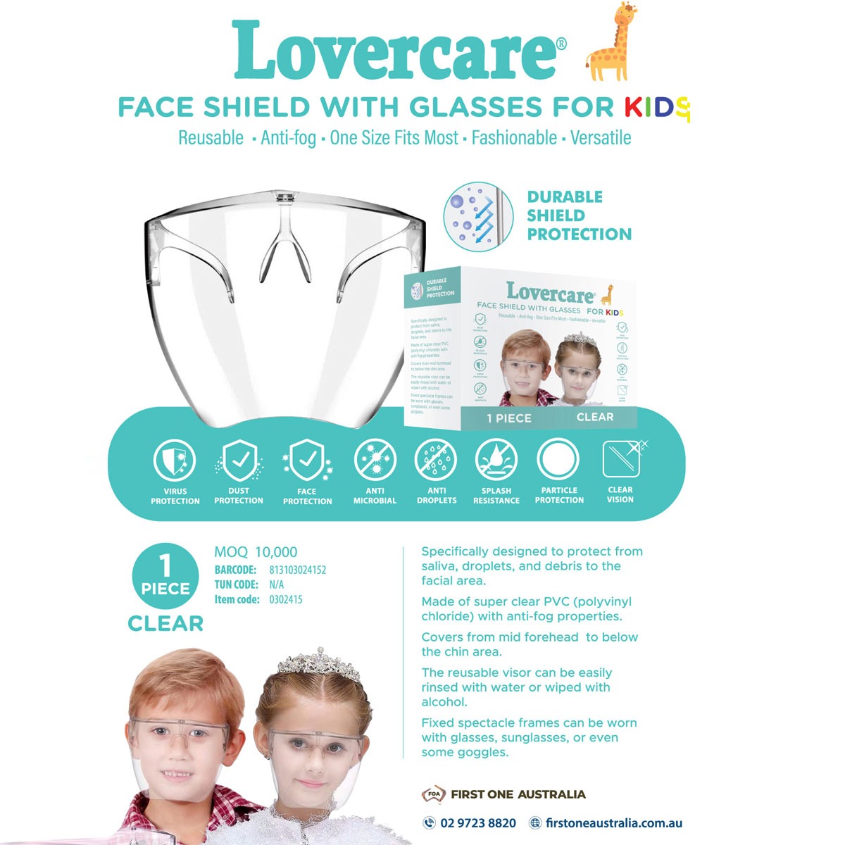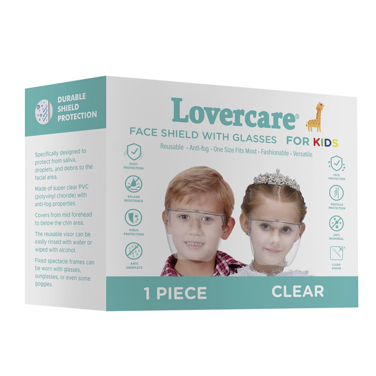 LoveCare Kids Face Shield with Glasses – Clear, 1pc. Lightweight, comfortable, and full-face protection designed for children’s everyday safety at school or play.